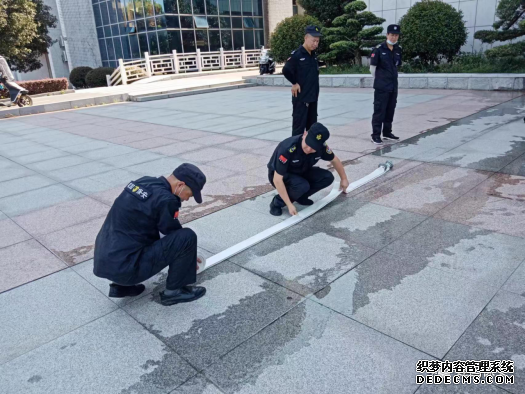 各班组展开训练,图为队员进行消防水管的的收放及操作使用。
