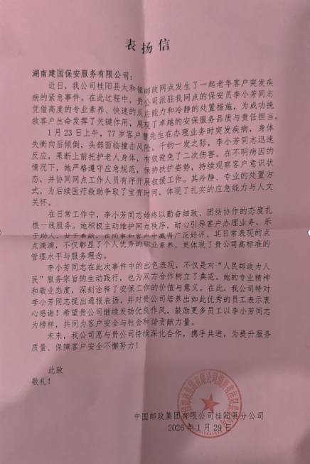 近日,中国邮政集团有限公司郴州两家分公司分别向我司发来正式表扬信,对派驻北湖路营业所的范红梅同志、太和镇网点的李小芳同志提出专项表彰。两位员工以卓越的职业素养和突出的现场表现,赢得了客户单位的高度赞誉,彰显了我司安保队伍的专业形象。