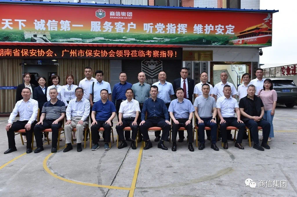 5月10日下午,原湖南省公安厅党委委员、副厅长、一级巡视员、现湖南省保安协会会长谭和平,原湖南省公安厅监管总队总队长、二级警务专员吴逊伟,湖南省协会专职副秘书长常自力、湖南省保安协会副会长、岳阳市政协委员、建囯保安董事长蔡建国、广州市公安局治安管理支队副支队长、广州市保安协会秘书长林慧聪、广州市公安局治安管理支队保安管理科科长、广州市保安协会副秘书长林永国、广州市公安局治安管理支队四级高级警长黄晓峰等一行18人莅临商信保安服务集团有限公司调研指导。南部战区战勤局原局长刘显军应邀出席本次调研指导座谈会。