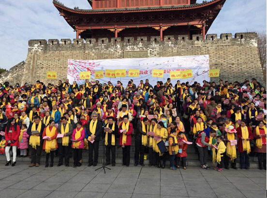 “先天下之忧而忧,后天下之乐而乐……”洞庭湖畔,岳阳楼前,2015年的元旦节,来自台北,上海,珠海等20几个城市的志愿者诵读早在900多年前重修的岳阳楼上,范仲淹写下的《岳阳