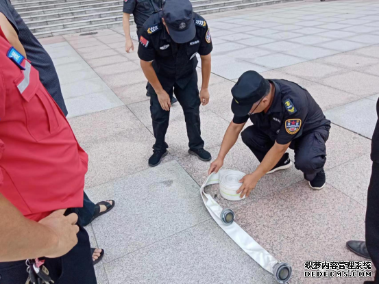 各班组展开训练,图为队员进行消防水管的的收放及操作使用。