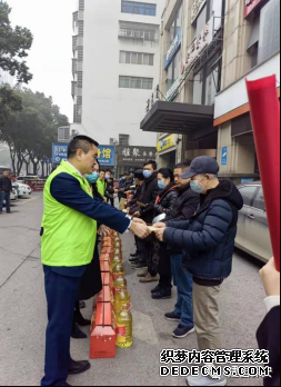 活动一: 2022年1月20日上午9时30分,湖南建囯保安服务有限公司董事长蔡建国率公司中层以上领导与岳阳花板桥社区领导在圣鑫城一楼集中看望困难的党员、退伍老军人、残疾人、公司员工、群众等,共同为20户贫困对象开展冬季送温暖活动。给他们送上春节八品茗茶大礼包、花生油、慰问金,让他们深刻感受湖南建囯保安服务有限公司及花板桥社区领导的一片深情厚意。这项爱心活动从公司创建至今已持续了9年之久。图为献爱心现场情况: