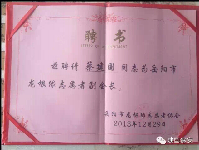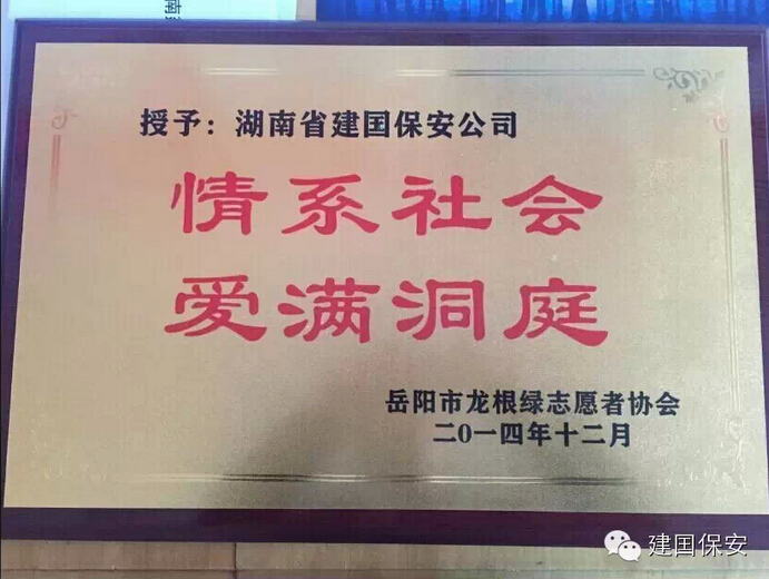 2015年元月10日,岳阳市龙根绿志愿者协会彭会长委派副会长、湖南日报报业集团三湘华声全媒体、三湘都市报岳阳记者站经理骆先文,湖南省优秀共产党员第三届岳阳市道德模范刘雄辉!送达授予:湖南建囯保安公司“情系社会、爱满洞庭”的爱心荣誉称号!建囯保安董事长亲自接牌!感谢岳阳市龙根绿志愿者协会所有领导及志愿者!我公司今后将更加努力的回报社会、奉献爱心、传播正能量!建囯保安、保您平安!