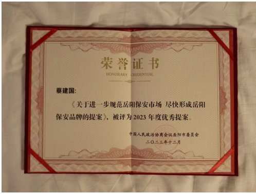“关于进一步规范岳阳保安市场,尽快形成岳阳保安品牌”的提案荣获岳阳市政协优秀提案。